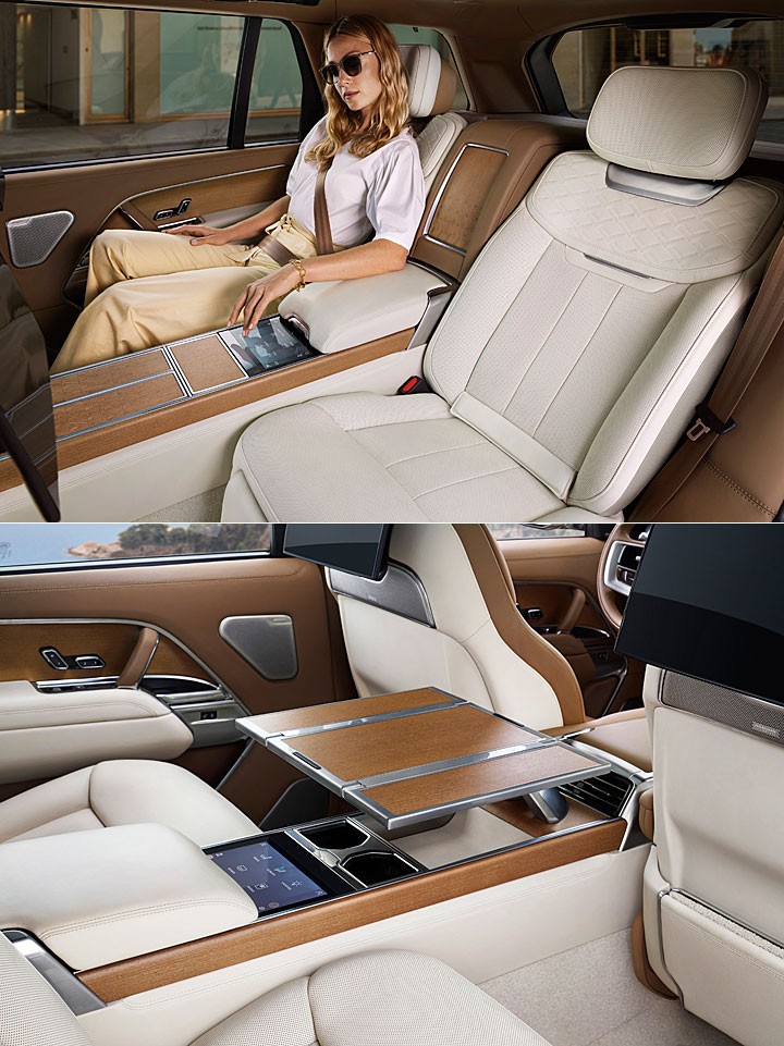 而新世代揽胜同步针对 SWB 短轴与 LWB 长轴提供标准 5 人座版本,顶规揽胜SV 动力车型分为为 SV Serenity、SV Intrepid、SV Signature Suit 等级,在 SV Signature Suit 之上提供 4 座布局,独特的是新世代揽胜也首度针对 LWB 长轴版本提供 7 座选项,并具有便利的第二排电动倾倒机能,方便第三排乘客进出。新世代揽胜也供应相当豪华且具科技感的 RSE 后座娱乐系统,其在前座椅背具备 2 组 11.4 吋高画质荧幕、搭配位在中央扶手的 8 吋控制荧幕,能透过 HDMI 提供荧幕镜向或装置连线,中央甚至还有电动升降的餐桌、置杯架。