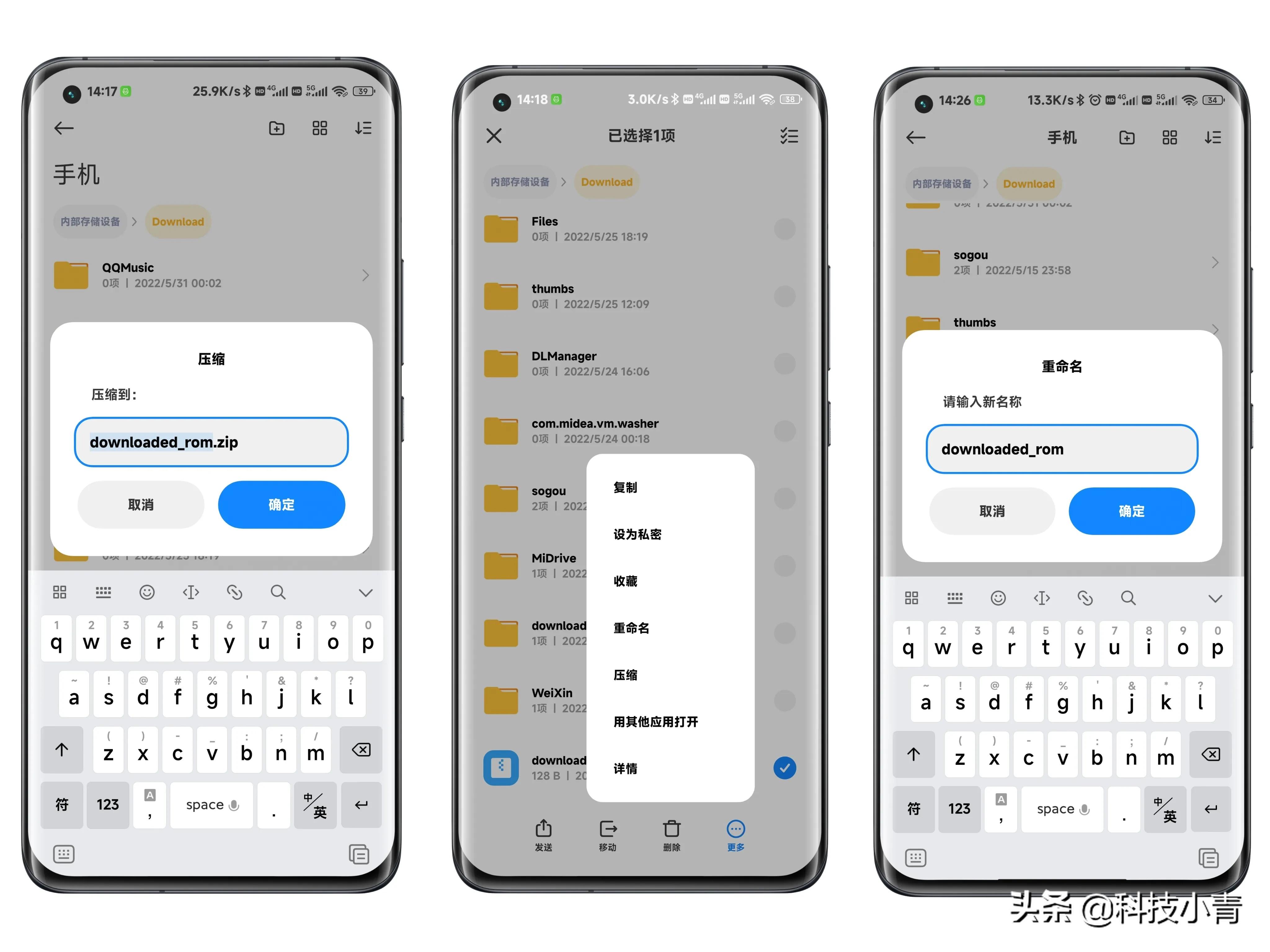 最后,最重要的一步,打开文件管理,打开Dowload文件夹,找到文件夹里面的downloaded_rom,长按选择压缩,如图三。