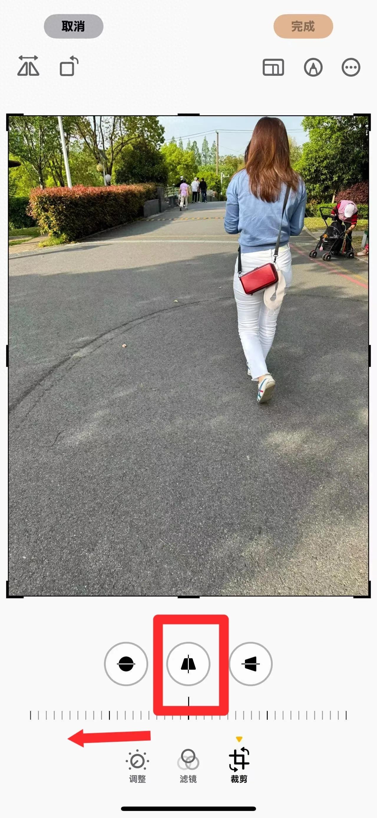 旅行抓拍总被拍成「五五分」?打开照片→点击「编辑」→选择「裁剪」里的「垂直变形」,手指轻轻往右滑,腿部线条立刻纵向延伸,膝盖到脚踝的比例瞬间优化!重点是不拉伸头部、不变形背景,连海边沙滩、街头巷尾的抓拍都能秒变超模视角,从此告别「尴尬游客照」