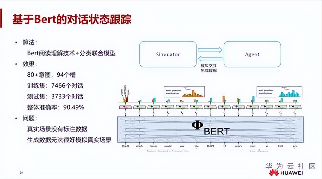 随着预训练火热之后,用 BERT 也能够解决对话状态跟踪的问题。可以通过 Bert 阅读理解技术,预测用户所说的话里面每个槽位的 Start pos 和 end pos,最终提取槽的值,同时它会再联合一个分类的任务去做联合模型。但是在真实场景中是没有标注数据的,所以我们一般会通过仿真器和一个机器人进行交互,这种交互的方式可以生成大量对话数据,同时也建立了一个访仿真器。通过这个仿真器,可以生成很多对话样本。现在根据我们的意图和槽位,生成大概有 7000 多个对话样本,训练集里面大概有 3000 多个对话样本,最后通过 Bert 阅读理解分类联合方式,它的跟踪准确率可以达到 90% 左右。但这也存在一个问题 —— 生成的数据可能无法很好地模拟真实的情况。