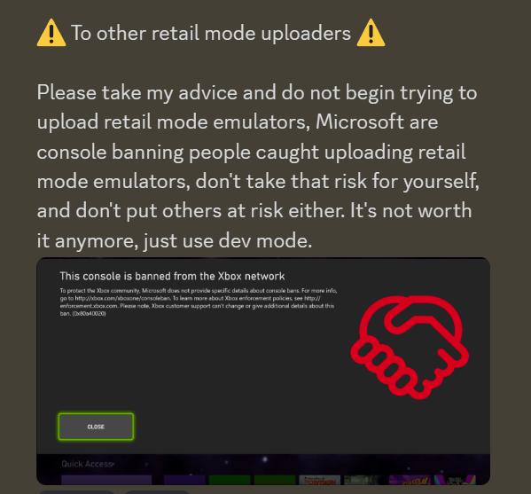 国外科技媒体 The Verge 编辑 Tom Warren 发布推文,表示从微软官方处获悉,如果玩家或者开发者依然向 Xbox Store 上传在零售模式下运行模拟器的软件,将采取封号处理。