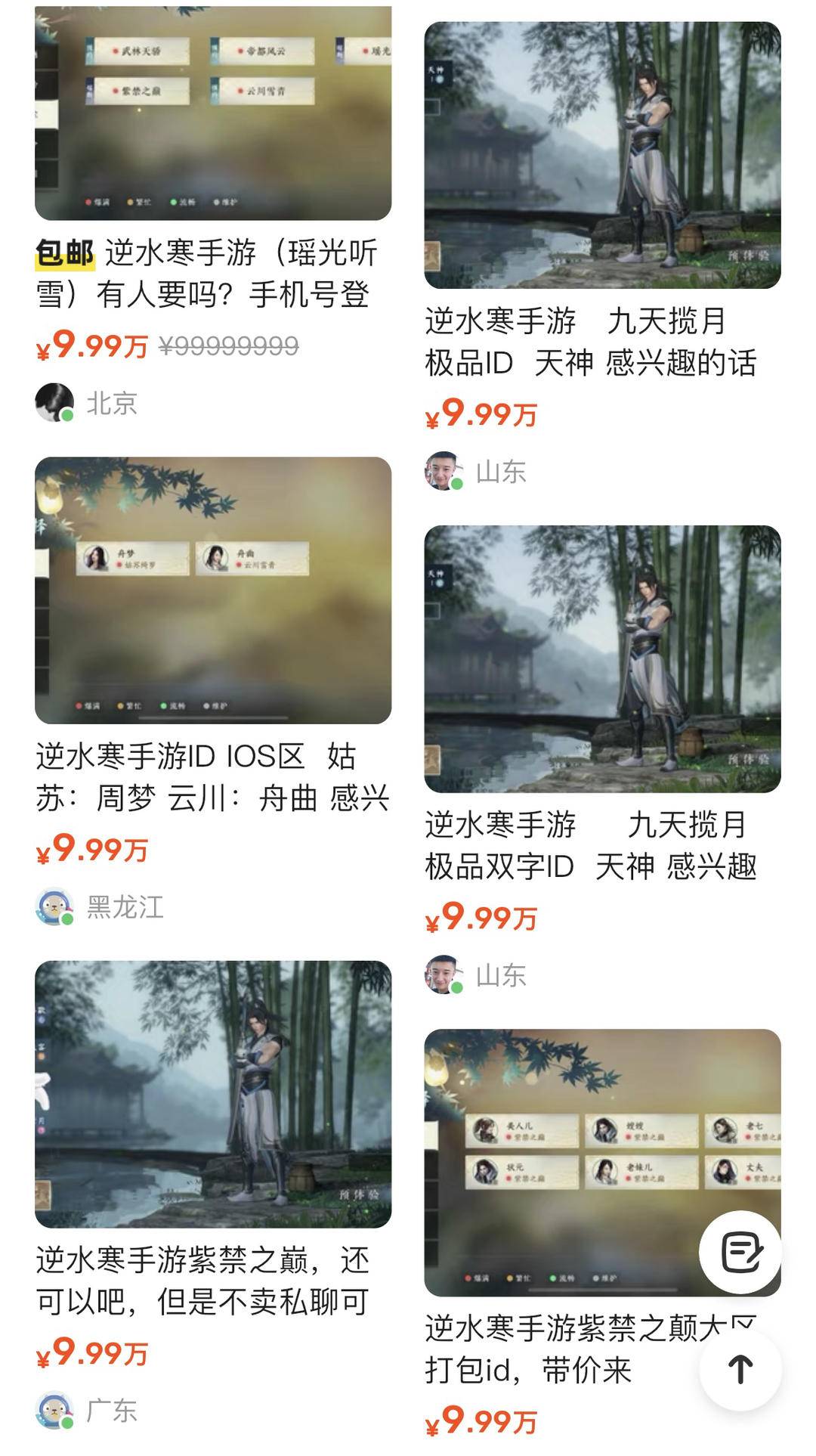 6月26日,网易旗下逆水寒手游开放了预下载,这款号称投资8亿打造的游戏将在6月30日正式上线。目前,游戏还未迎来上线,就迎来了一阵风波,近日网传消息,在二手交易平台,一个名为“宝贝”ID竟要卖50万并疑似已经成交,目前该账号已被封禁。但紫牛新闻记者调查发现,二手交易平台上仍有叫卖逆水寒手游ID的,价格从几百到万元不等。