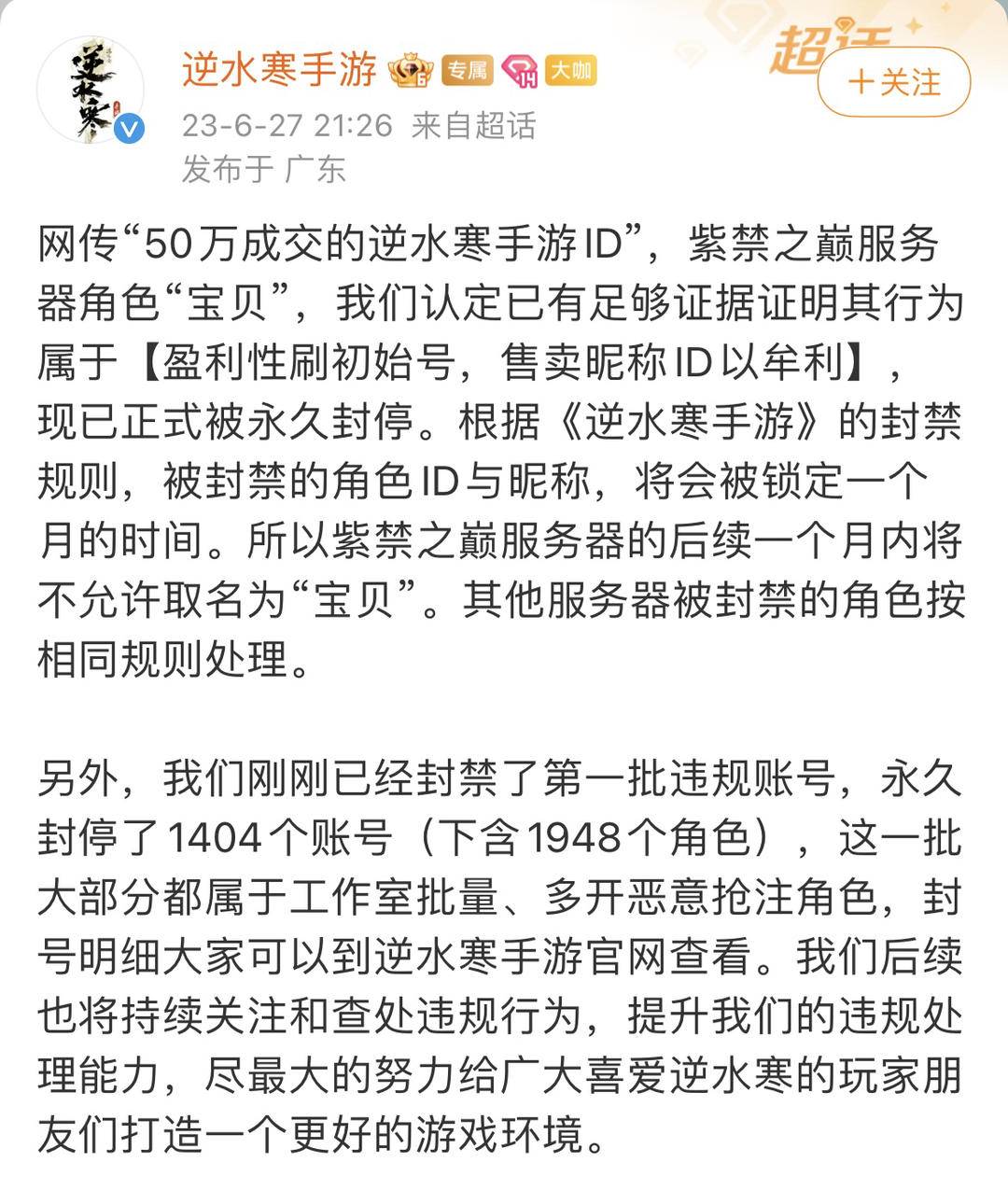 据网传消息,叫价50万的ID昵称“宝贝”是在逆水寒手游区服紫禁之巅。6月27日网易发布公告间接承认该情况存在,并称已将该账号封禁,公告中说“网传‘50万成交的逆水寒手游ID’,紫禁之巅服务器角色‘宝贝’,我们认定已有足够证据证明其行为属于【盈利性刷初始号,售卖昵称ID牟利】,现已正式被永久封停。”公告还表示,被封禁的角色ID昵称将被锁定一个月,该服务器后续一个月内不允许有角色取名为“宝贝”。