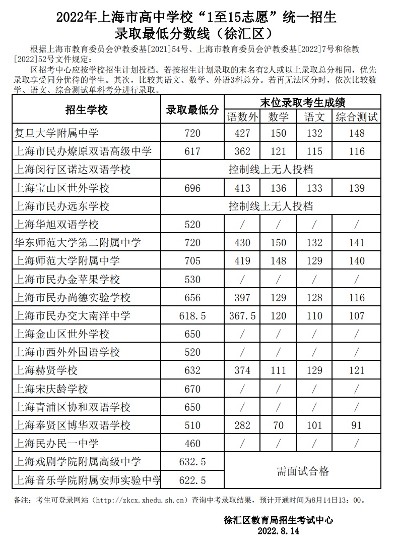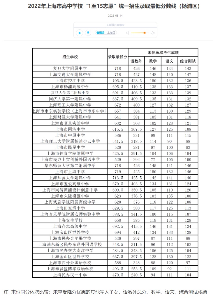 今天(8月14)上午,上海各区公布了统一批次“1至15志愿”招生录取的最低分数线,学生可通过报考区的招考机构网站查询录取结果。