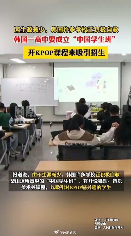 据凤凰WEEKLY报道:据韩国EBS电视台6月5日报道,韩国釜山一所艺术高中计划明年(2025年)开设“中国学生班”。报道说,由于生源减少,韩国许多学校正积极自救釜山这所高中的“中国学生班”,将开设舞蹈、音乐。美术等课程,以吸引对KPOP感兴趣的学生。EBS电视台说,这将是韩国第一个专门招收留学生的高中班级。