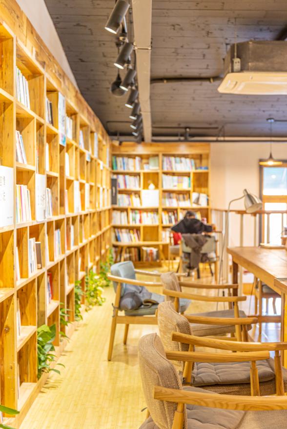 面积不大,却不乏精妙的装潢,暖黄色的灯光和敞亮整齐的木质书架在这里给人安静悠闲的氛围感。