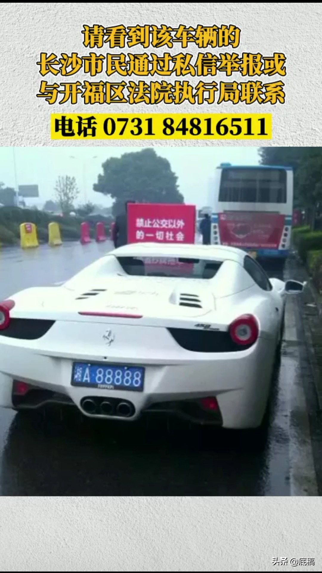 3月2日,湖南省长沙市开福区人民法院发布了一则消息,广大网友如发现车牌号为“湘A 88888”的法拉利车辆行踪,请及时向开福区人民法院执行局提供线索,若使法院能够实际扣押该车辆的,申请执行人承诺支付赏金5000元。