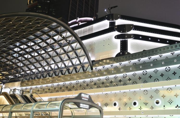 从外观看,这座船型建筑从装饰Monogram图案的优雅船首,到形似经典硬箱的层叠式顶层结构,无不彰显品牌精髓。