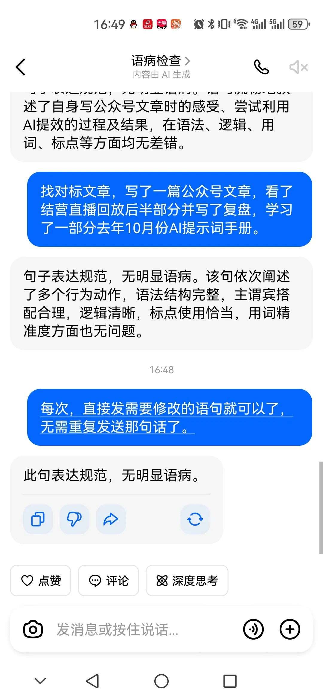 每次直接发需要修改的语句就可以了,无需重复发送那句话“这句话可有语病?”