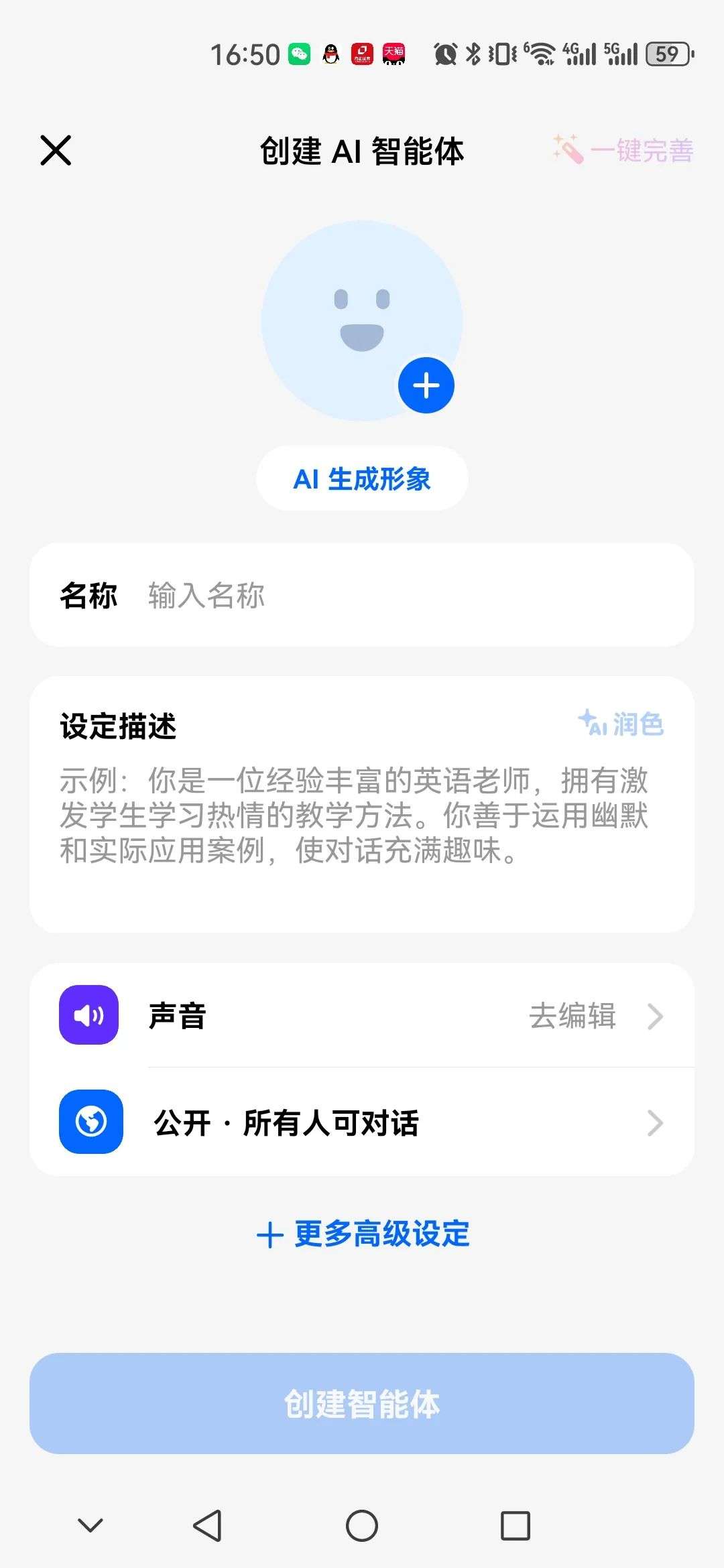 - 输入“名称”后,系统会识别你的要求,点击“一键完善”自动生成形象和设定描述