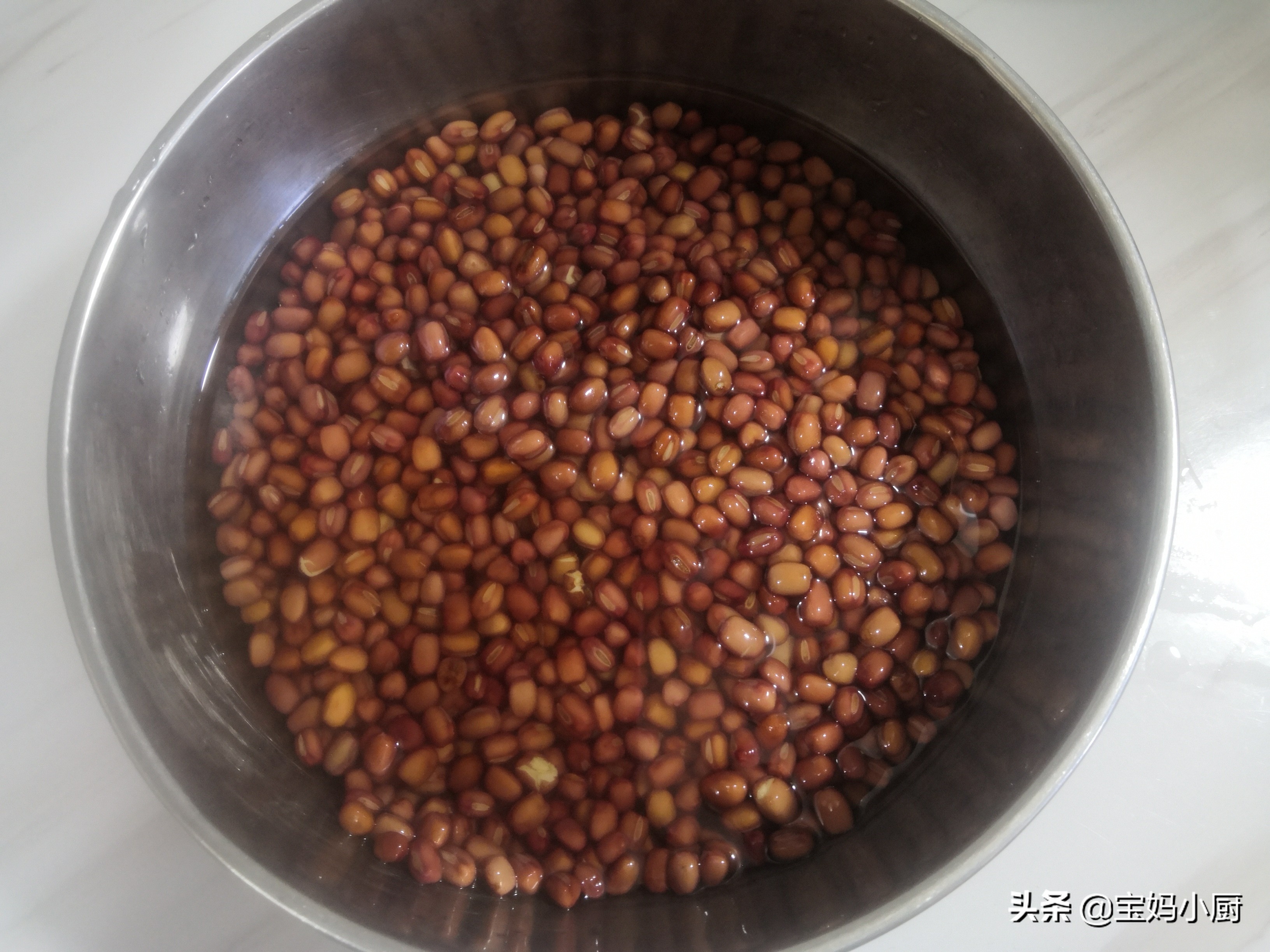 第二步,红小豆挑去里边的杂质,把它洗净,加水浸泡一夜