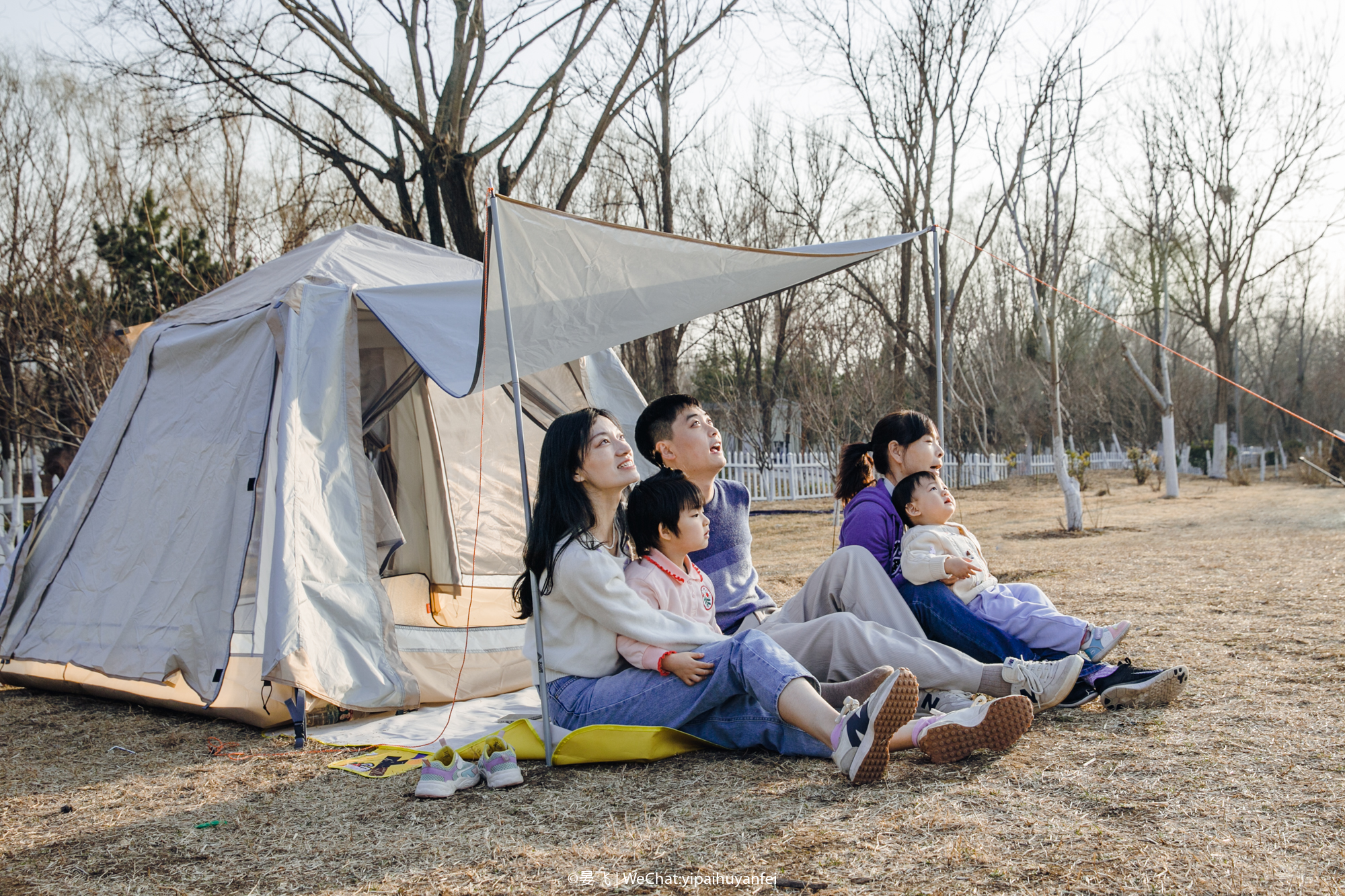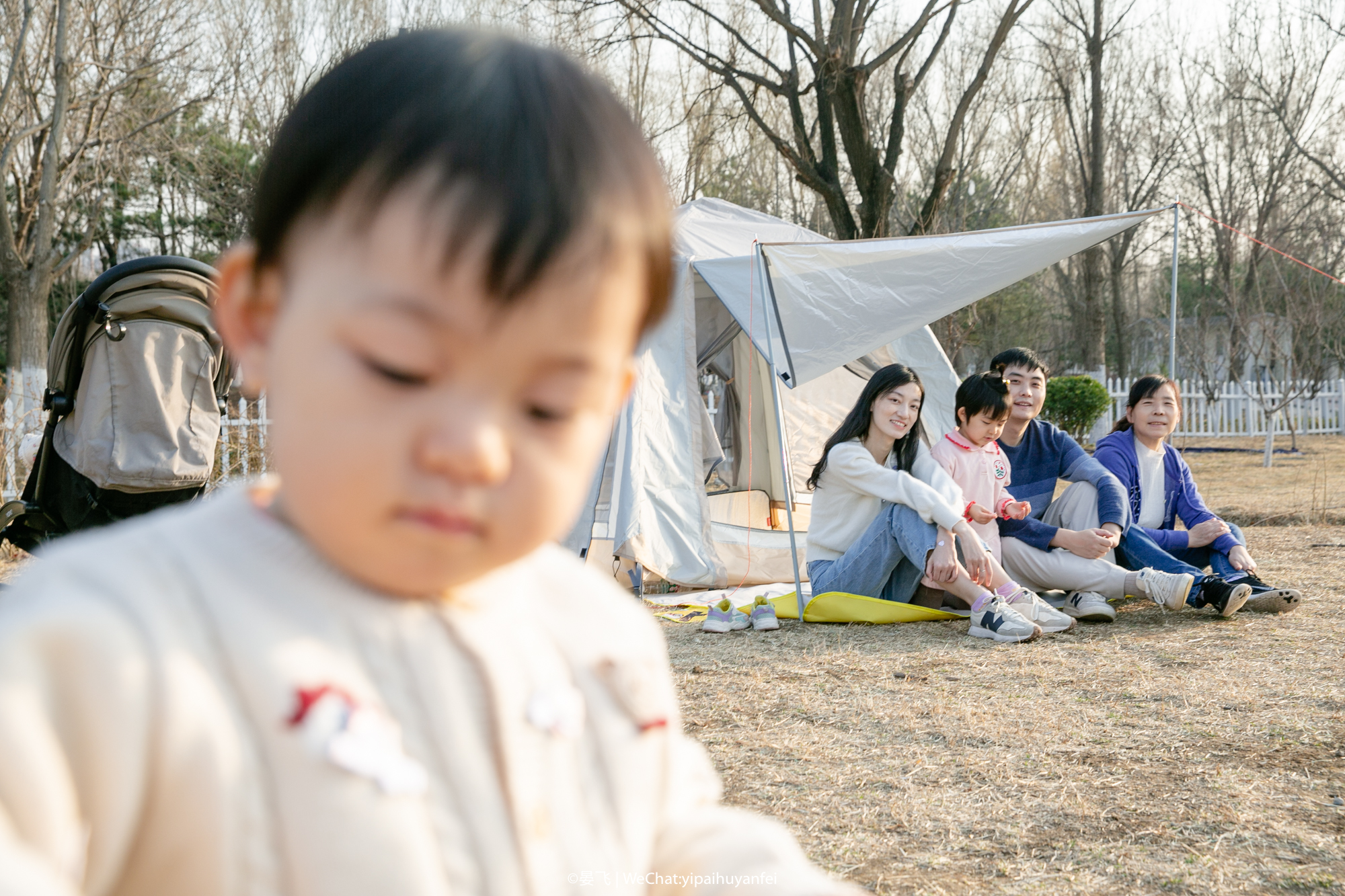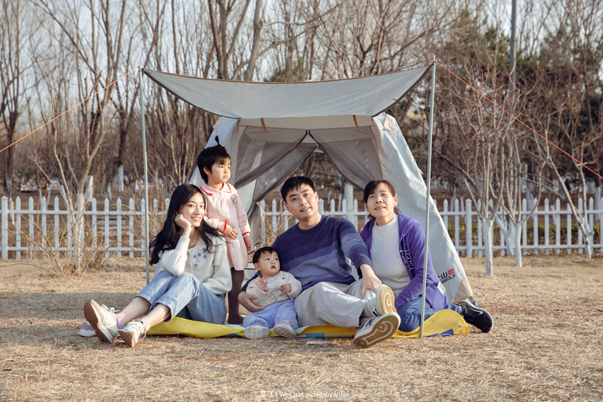 还有就是很多人一拍照,它的手就不知道该放哪了,动作怎么摆怎么僵硬,所以我想分享的第三个技巧就是有事干。就是合影的时候,可以安排一个小的情景,让大家有事做。比如我拍的这一家人,他们正在搭帐篷露营,所以我就让他们把头伸进帐篷里,因为帐篷正好是个框架嘛,像个小房子一样,就好像是一家人在房子里拍照一样。那两个小朋友呢?她们才不听你的安排呢,她们就在帐篷里耍就好啦。其实你也不用安排,因为她们其实是最会拍照的,她们有没有相机都一个样,都不紧张,这样拍出来的照片就会比较自然,比较活泼。所以就是我们要给大家找一个事情去做,给大家一个指令,而不是让大家傻傻地站在那。