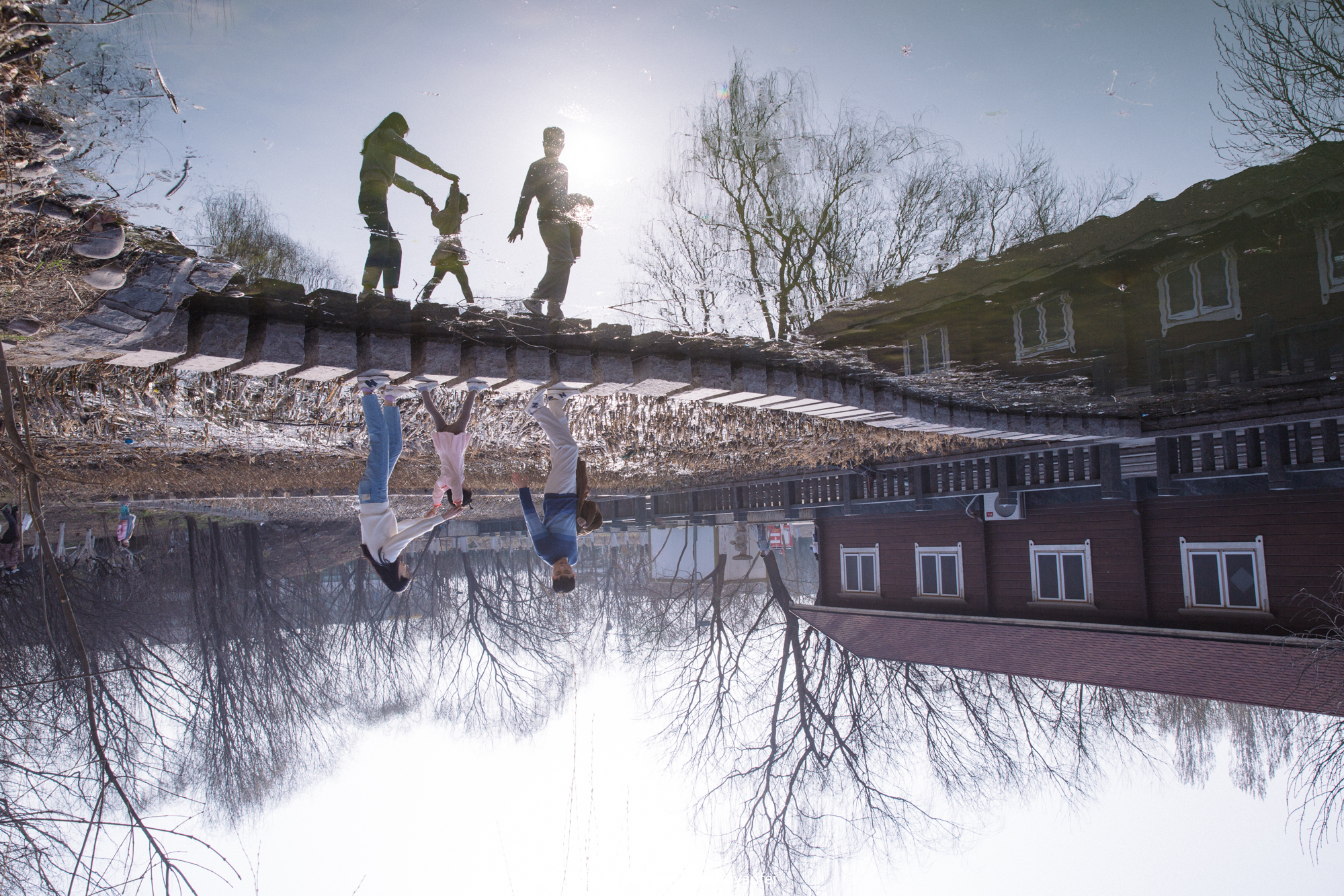前面这三个技巧,都是教大家拍合影的时候怎么才能不死板,把合影拍得活泼一点。第四个技巧就是拍摄内容的方面,就是我们合影不一定非要拍到脸。我给大家看的这个照片,是拍的一家人在水里的倒影,他们的脸也是看不清的。另外我还很喜欢拍一家人的背影,就是我看到一个很好的场景,我就说:你们可以一起往前走一走啊,我在后面捕捉他们一家人往前走的这个画面。当然这个“不要脸”你也是可以拓展的,比如我们只拍每个人的手,干杯,这是不是一种合影。或者我们从上往下俯拍所有人的鞋,每个人的鞋其实也是代表了每个人不同的身份啊、年龄啊这些特征的,是吧,这也是一种合影。拍大家的影子,也是合影,“不要脸”是有很多种方法的。