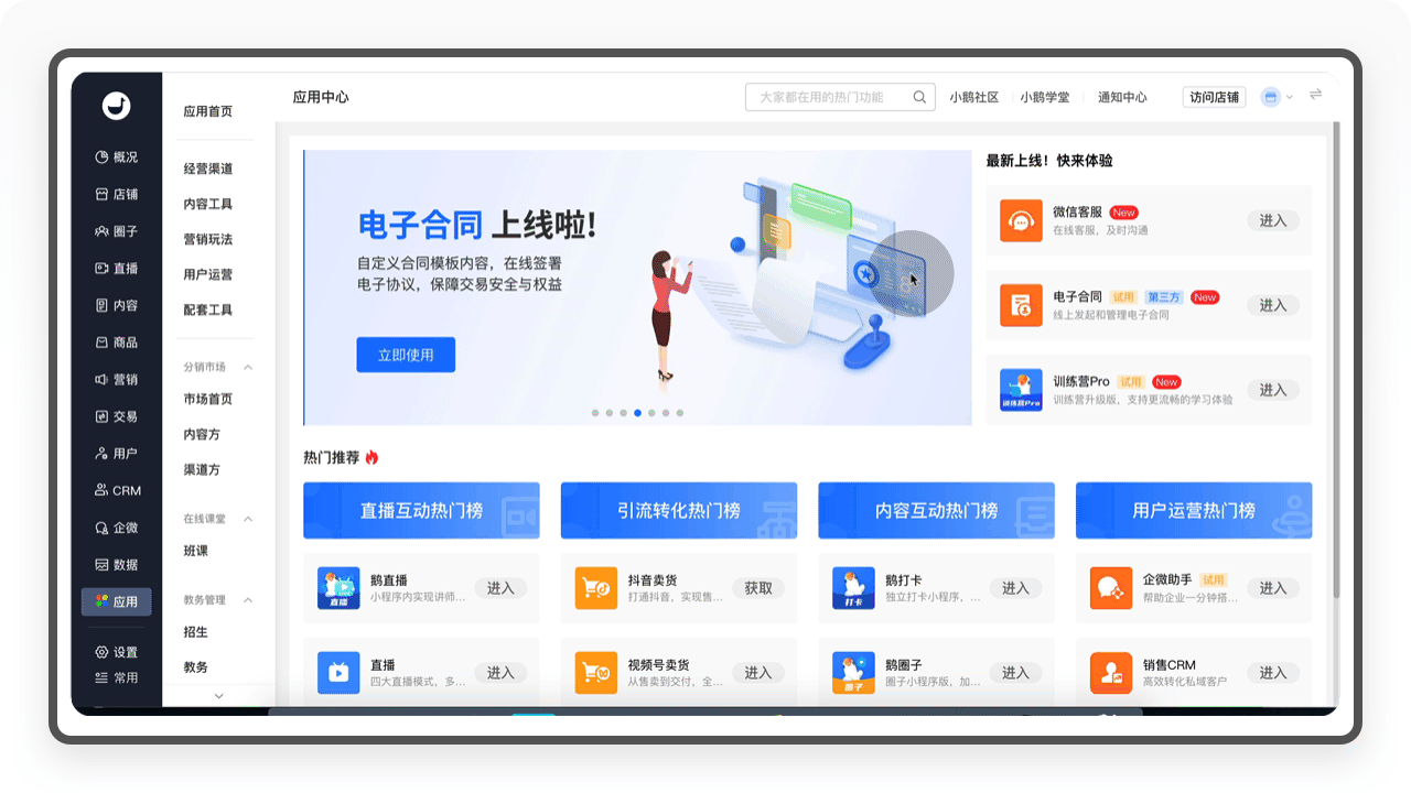 所谓应用,其实就是小鹅通系统中的一个个核心功能,比如直播、圈子、打卡、邀请码、拼团、优惠券、企微助手等。从应用中心看,小鹅通的应用主要分为经营渠道、内容工具、营销玩法、用户运营和配套工具五大类,包含上百个热门应用。这些应用不仅可以单独更新维护,对于商家来说,就像拼积木一样,可以使用和购买自己需要的应用。