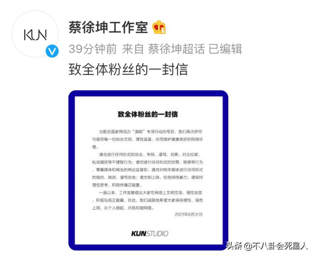 同时,蔡徐坤工作室还呼吁粉丝不要和网友吵架,现在还是在清朗时期,可不要当那只出头鸟。