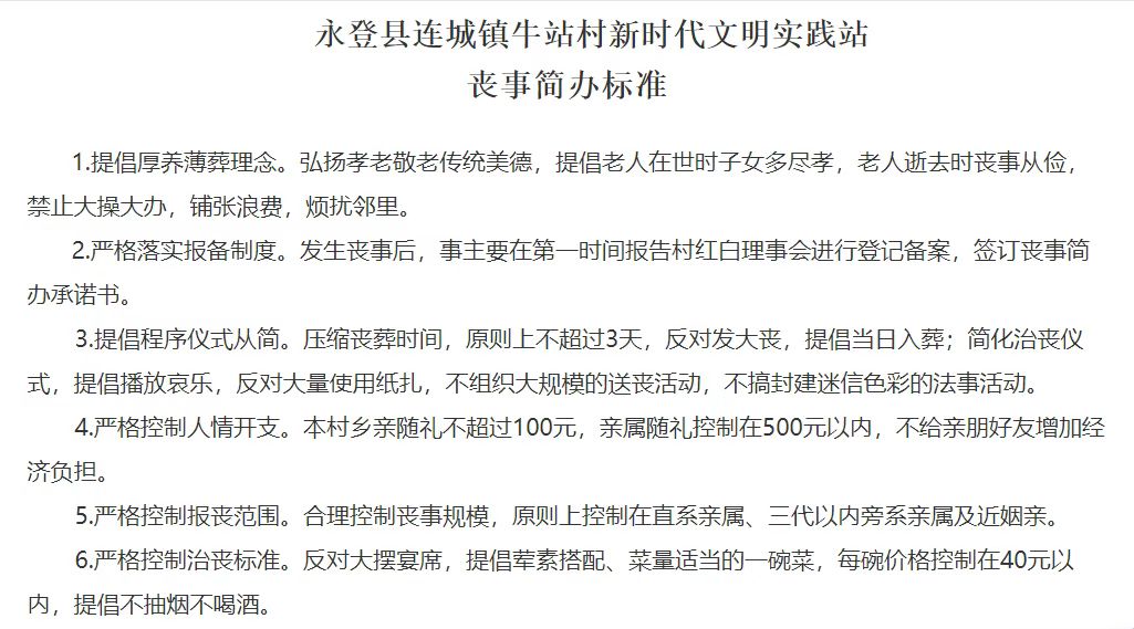 在甘肃永登,今年3月份,民乐乡“推进移风易俗 倡树文明新风”倡议书(以下简称《倡议书》)提倡婚事新办、丧事简办,喜事廉办,严格控制宴请宾客规模和烟酒档次(酒席标准6菜1汤,烟不超过10元,酒不超过100元),鼓励自助餐、简餐、家常便饭宴请宾客,落实光盘行动。