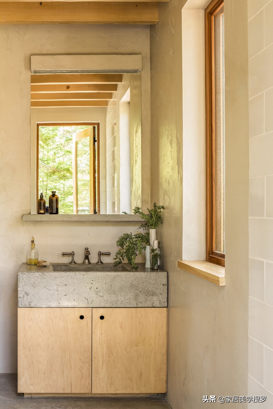 在浴室里,一个由当地工匠浇筑的混凝土水槽和搁板坐落在一个桦木梳妆台上。