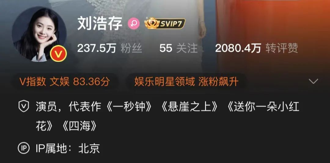 但跟那些微博粉丝动辄千万的顶流爱豆们比,刘浩存的粉丝数能带动多少购买力也挺存疑的。