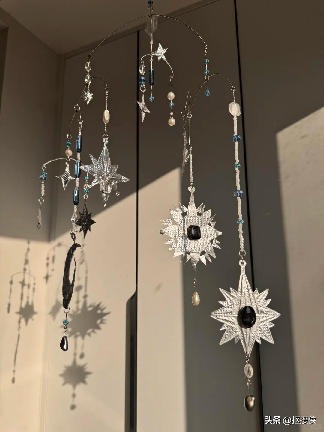 用铝箔纸制作成太阳月亮的造型,然后拴在吊饰上,在做装饰,课程中会使用到热熔胶粘贴,让其更加牢固,挂在家里满满的成就感。