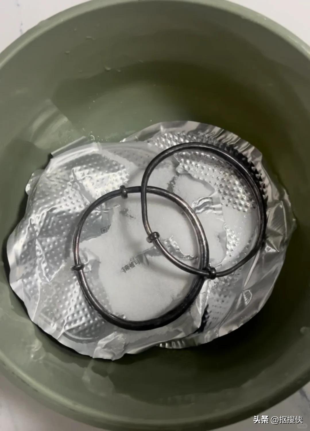 然后加入一勺盐,再把发黑的银首饰放入其中,倒入开水浸泡几分钟之后,银手镯上面的黑渍就自动溶解掉了,银子会恢复原来的光泽度就跟新的一样。
