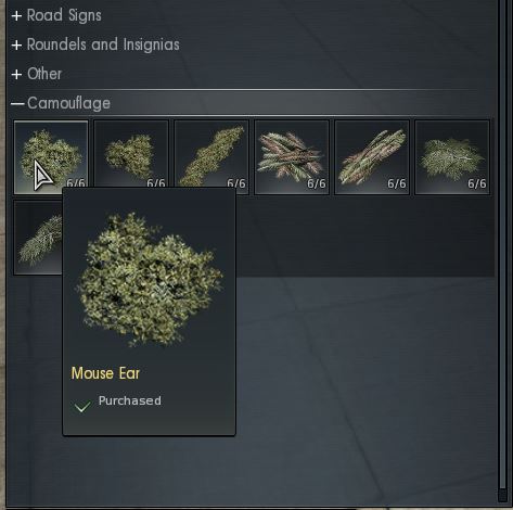 包含灌木丛与树枝、各种标示牌、头盔以及弹药,这些都曾被放置在某些载具的某些部位上