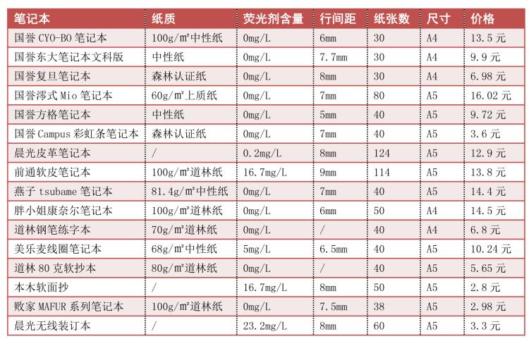 前通软皮笔记本、本木软面抄、晨光无线装订本最好不要买,荧光剂含量都达到了“中”的程度;