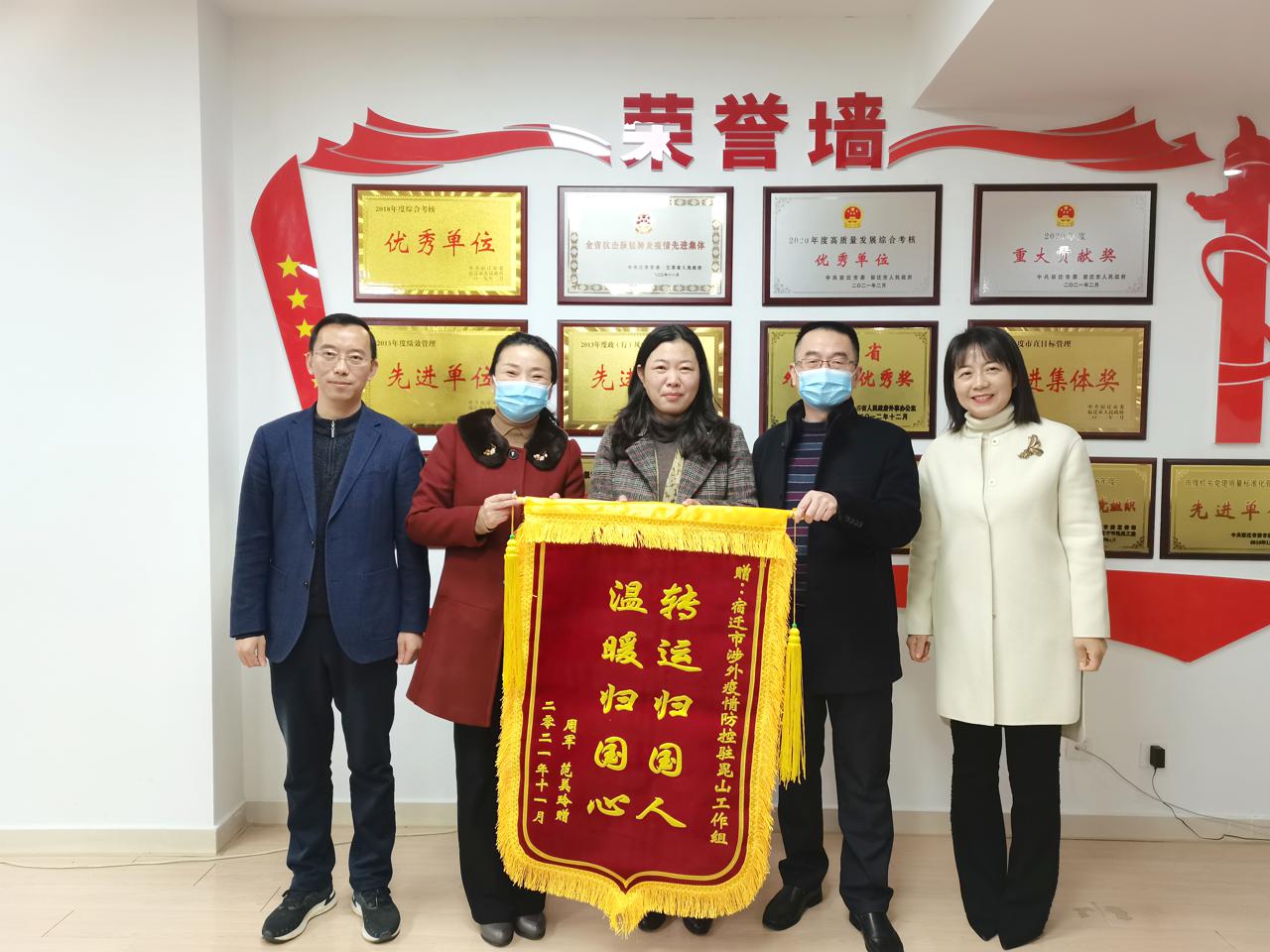 “工作人员当时的那句话,还有一路上的悉心照顾,总会浮现在眼前,心里很温暖。”范女士的丈夫周先生告诉记者,12月1日上午,解除了隔离后,他们俩第一时间订作了这面锦旗,向宿迁市外办致谢。