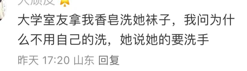 香皂送给她了,你用她的毛巾擦脚。他问你就说我的毛巾要留着擦脸。