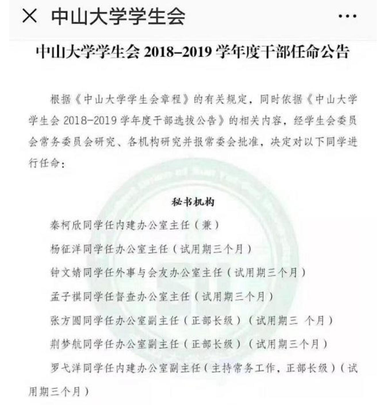 所谓“行政化”,就是把学生会自治组织当成了一个“行政机构”,里面的学生干部都具有“官衔等级”。例如,中山大学学生会官方微信公众号发布的《中山大学学生会2018—2019学年度干部任命公告》,公示了200多个学生干部岗位,在“秘书机构”和“组成部门”两层级中,还特别标明了职位是“正部长级”还是“副部长级”。“官衔等级”意识特别明显,而且还标明了“试用三个月”,和政府机构、事业单位的用人制度简直“一模一样”。