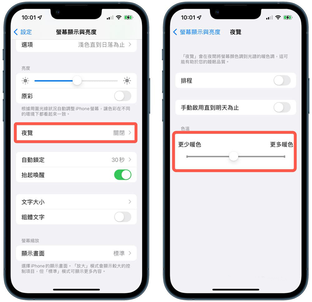 iPhone夜览功能设定位置:可以透过【设定】>【屏幕显示与亮度】内点选【夜览】,将最下方色温调整到中间值,屏幕就能回到原本正常色温。
