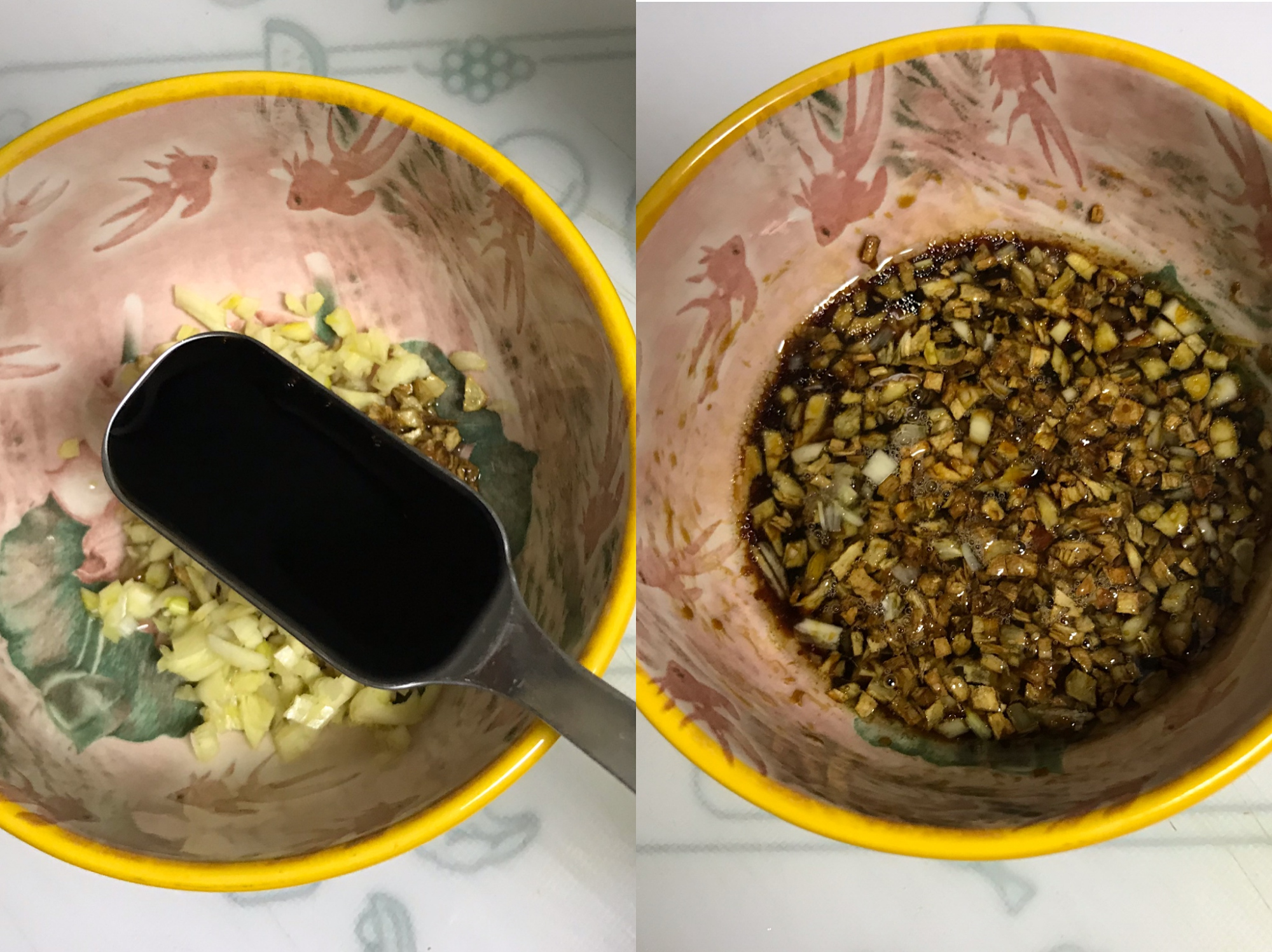 2、蒜汁的制作中,也可以全部都将蒜末先炒一下,分一半一半的混合操作,会让蒜香味更浓郁,所谓的金银蒜末也是指一半炒至金黄色,同另一半没处理的蒜末混合。