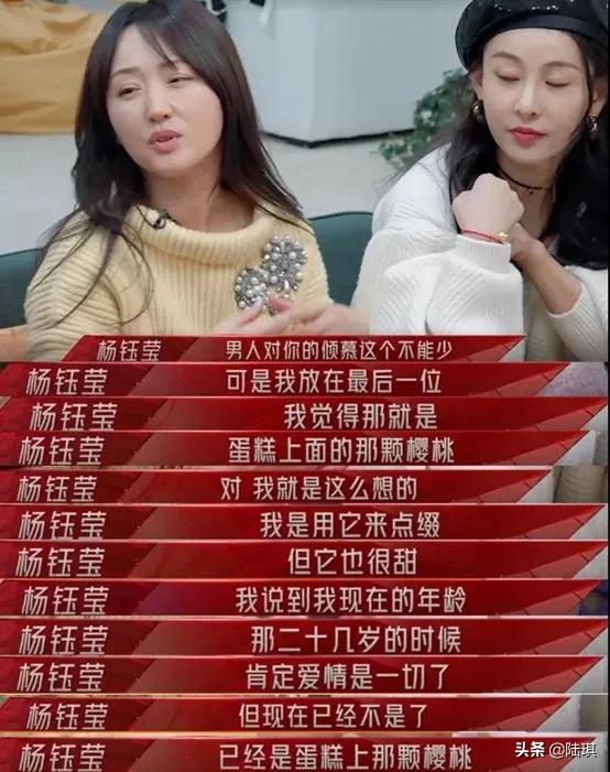 “我觉得,男人对你的倾慕不能少,但我放在最后一位,因为爱情像蛋糕上的樱桃,虽然很甜,但只是用来点缀。”