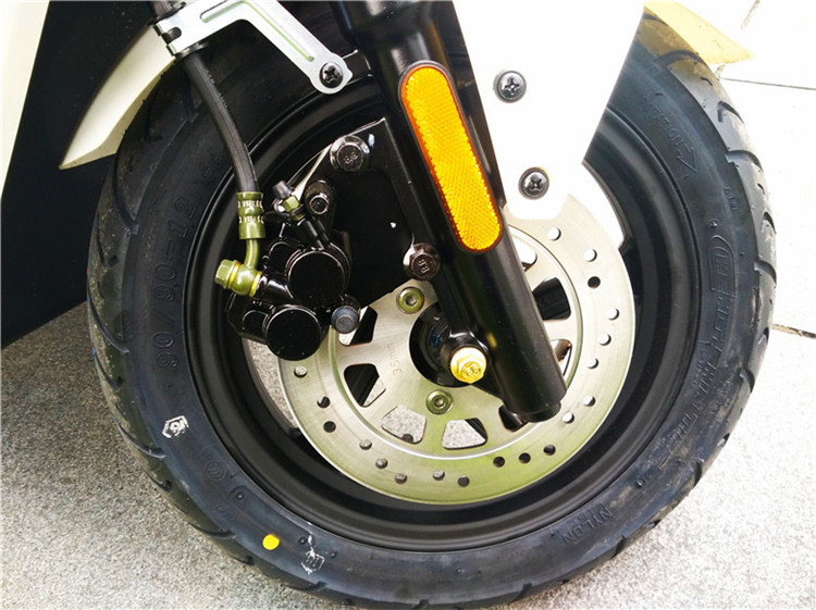 液压前碟刹,液压后碟刹+EBS刹车,带能量回收系统。这个使用碟刹和鼓刹的区别,如果用过传统的电瓶车,有过对比,优越性就非常的明显。不过使用的120-70-12真空胎,虽然刚开始用性能也是非常不错。不过经过一段时间骑行,特别是在光滑地面,下雨天水泥地面,当开车转弯时,还是能明显感觉有侧滑现象。所以雨天还是建议缓行,不要开过快的车速。