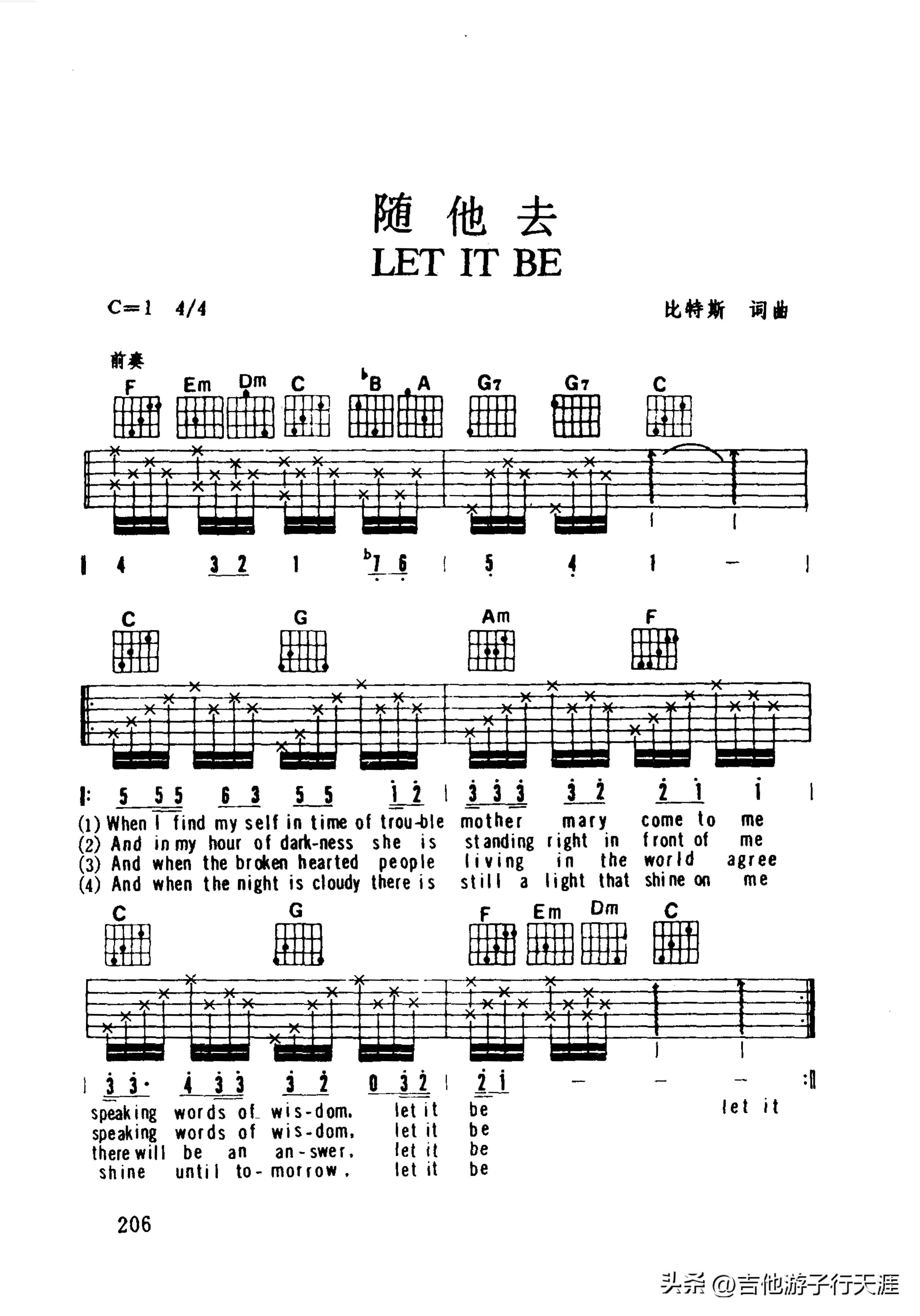 此首《随他去》(Let It Be)选自吉他游子历年收集的的吉他书籍。一切都随其自然,被誉为上世纪最伟大的歌曲之一,由披头士(甲壳虫/保罗·麦卡特尼)演唱,这首弹唱歌曲收录在叶莱、筱琳老师1991年编著的《浪漫的吉他-弹唱流行金曲》。这是一本很经典的吉他弹唱曲集。