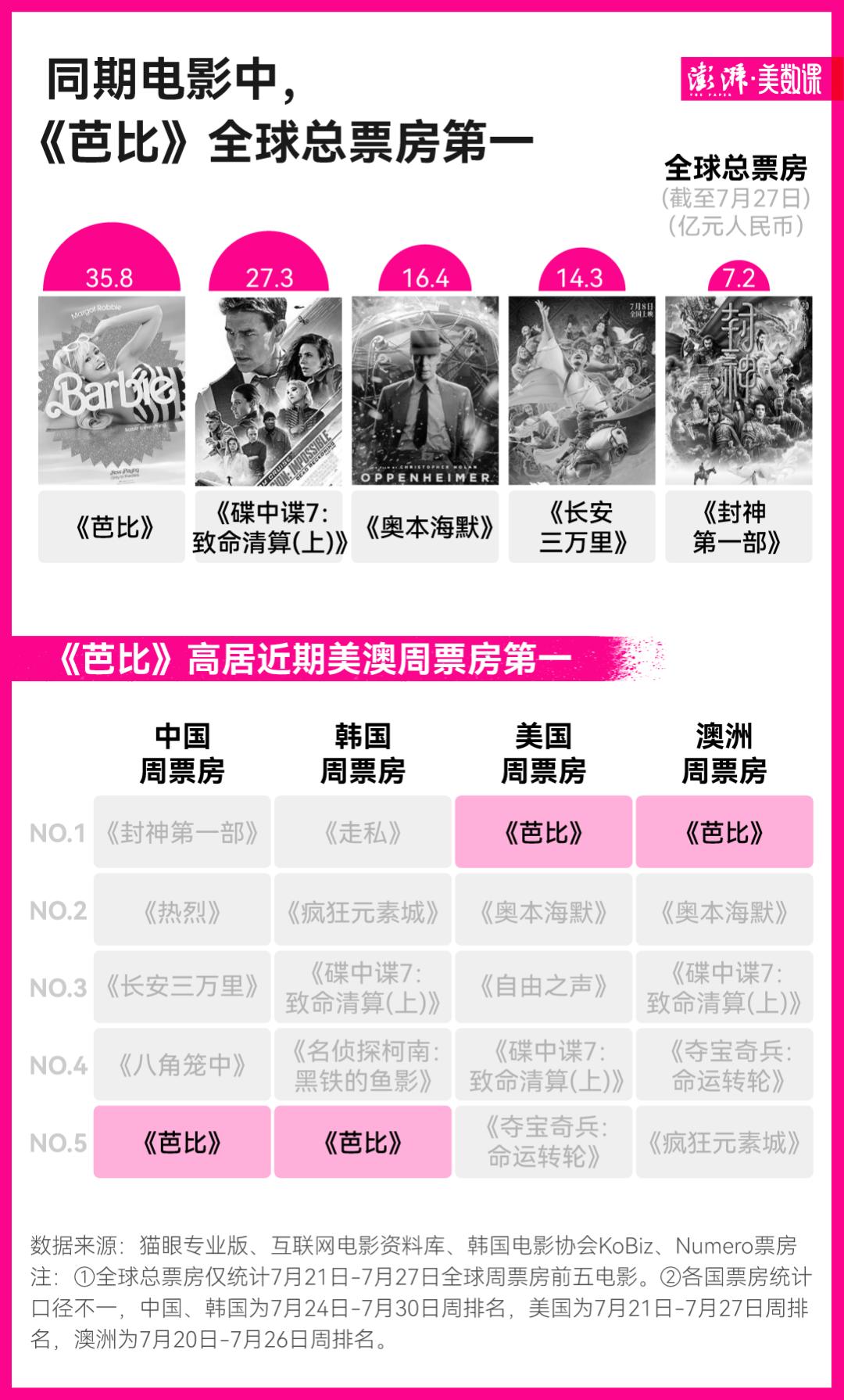 根据猫眼专业版全球票房最新统计,截至 7 月 27 日,《芭比》位居全球票房第一,但它的高热度并非“全球统一”。