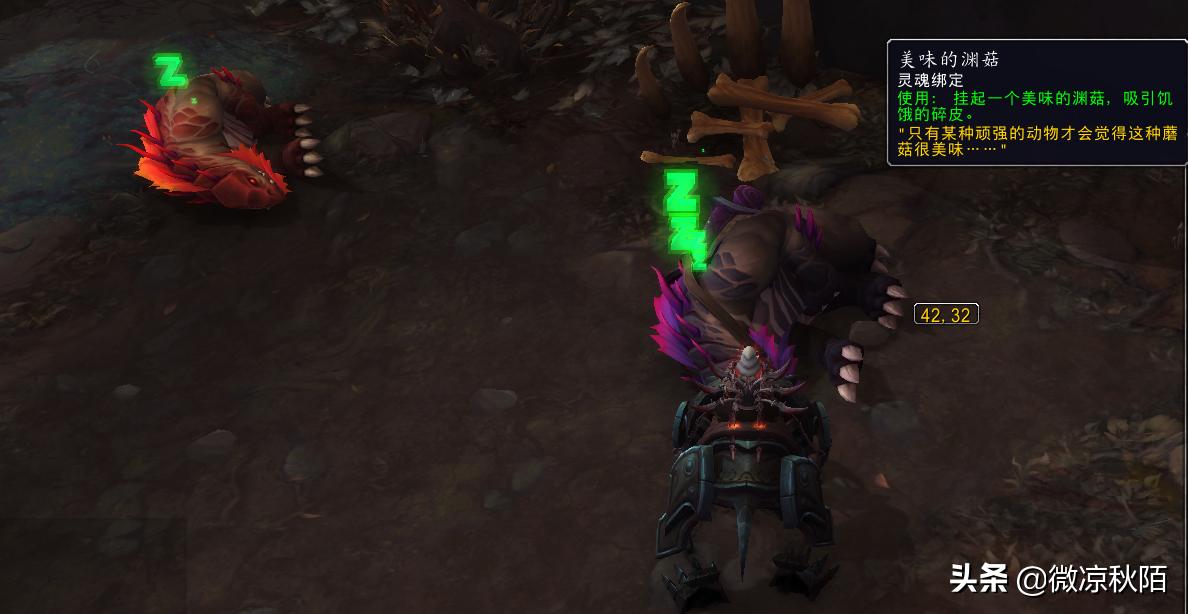 只要背包里面有“美味的渊菇”,前往红色标记的坐标“42:32”,可以看到一只睡眠状态的碎皮兽暗欧,使用渊菇会自动骑乘暗欧,骑乘时间是两分钟。切记,一定要骑乘满两分钟,不能中途下坐骑,时间不足会不计入进度,骑乘六次后自动获得暗欧坐骑。