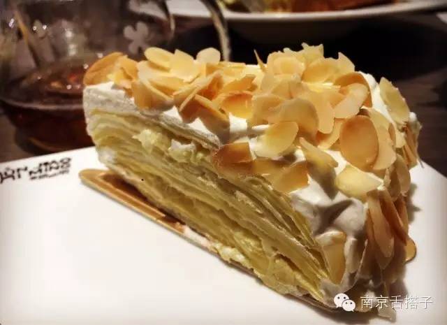 这道甜点不得不说啊!只要谁家有这样的一份甜点一定会圈粉无数。榴莲的味道十分的浓郁,而奶味也非常的浓郁。千层的口感比较浓厚,这样的绵密的口感也是很多人喜欢千层这样一道甜点的原因。顶部和侧面洒满了杏仁片,也让甜点多了一点嚼头。喜欢榴莲的你一定不可以错过!