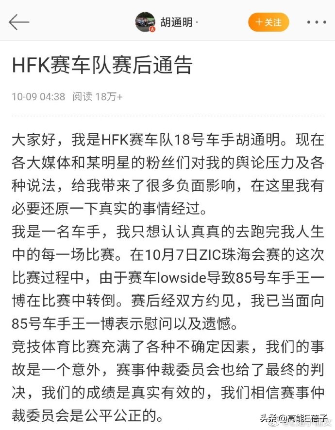 胡通明也已经在朋友圈喜滋滋地晒出了冠军奖牌。有意铲车也好,意外事故也罢,摔车事件已经有了一个官方定论,但风波还在赛场外继续。