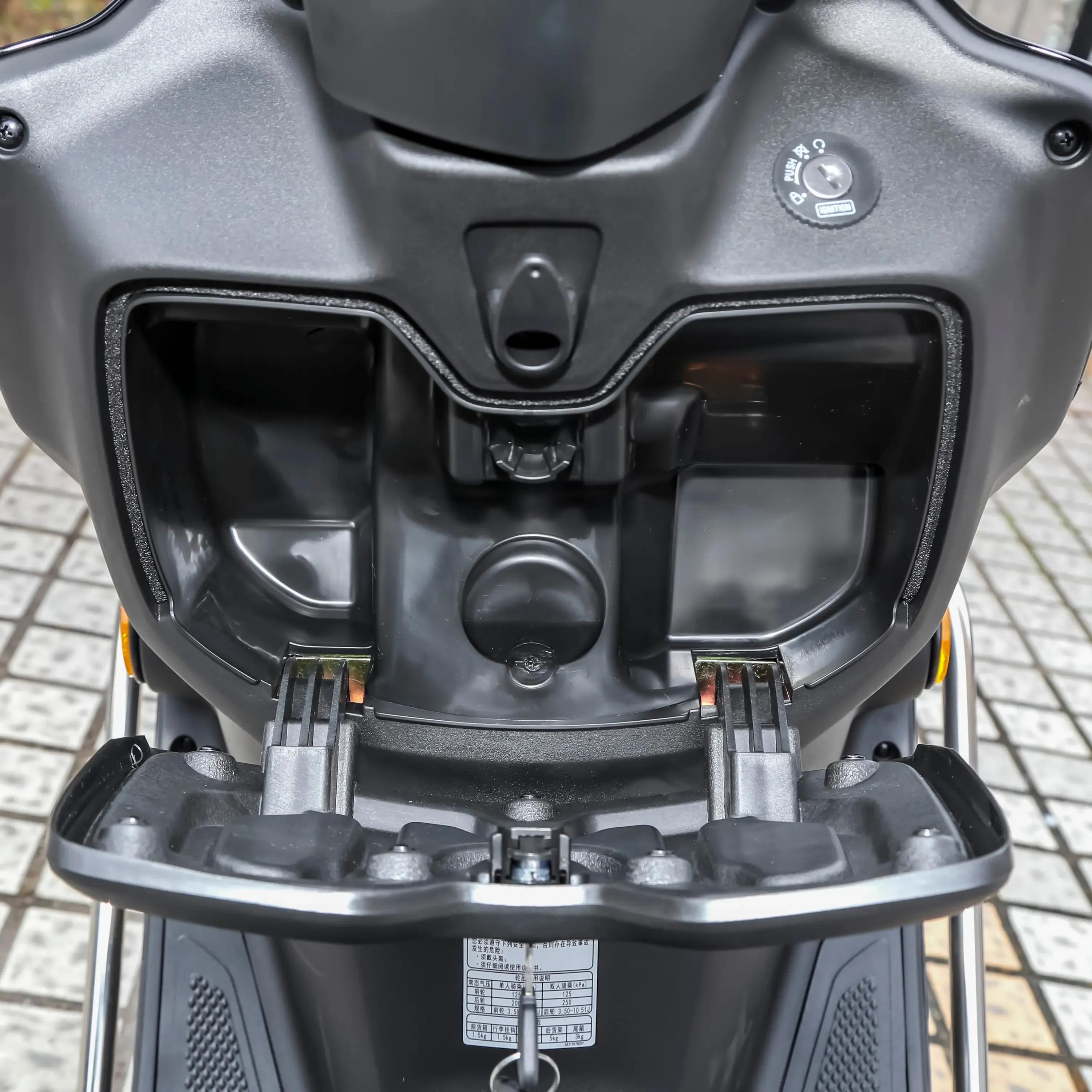 配置磁性防盗锁,同样是前后鼓刹+机械仪表,但配备防滑座垫和加长脚踏空间,前开放式储物盒只有左侧可用,右侧仅为一条窄缝,估计只能放一部手机,表现一般。