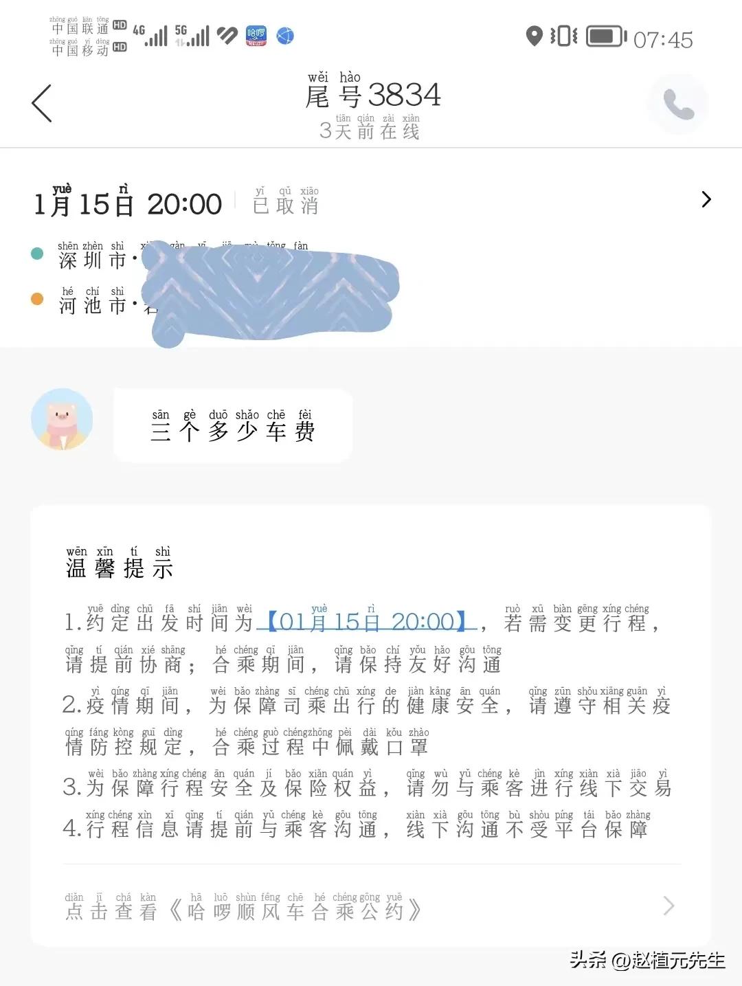 案例1,深圳到柳州3人不拼车,车费好像是一千三百多(当时我都不知道怎么抢到的不拼车单,还稍激动了一下)。乘客发信息:“1100”,就想取消。但我一想,直接回出高速费,乘客自己就取消了。于是直接回了信息“出高速”,不出所料马上就取消了。下面的这个案例雷同,但沟通方式和态度我很不喜欢。