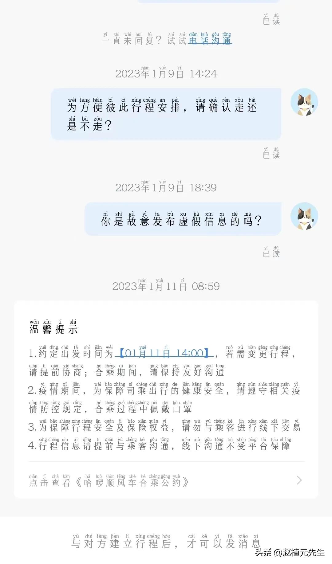 下午二点多,我又发了一条信息让确认行程。下午六点多,发信息直接了当的问:“你是故意发布虚假信息的吗”。当然还是显示己读则不回复,电话打不通。