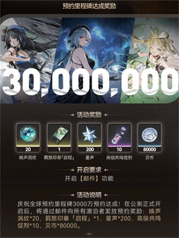 - 预约20抽领取位置及要求领取位置:邮件开启要求:解锁邮件功能活动奖励:唤声涡纹x20、羁旅印章「启程」x1、星声x200、高级共鸣促剂x10、贝币x80000注意事项:奖励邮件发放期至2025年5月22日11:59(UTC+8),请及时解锁【邮件】功能查收。