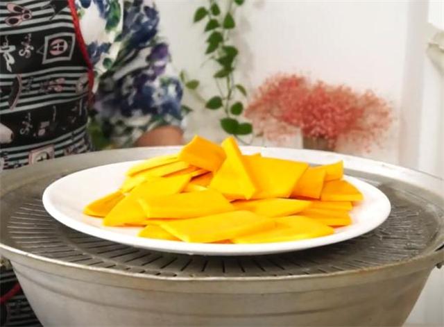 1.准备一小块南瓜,把南瓜去皮切片,上汽后蒸15分钟。