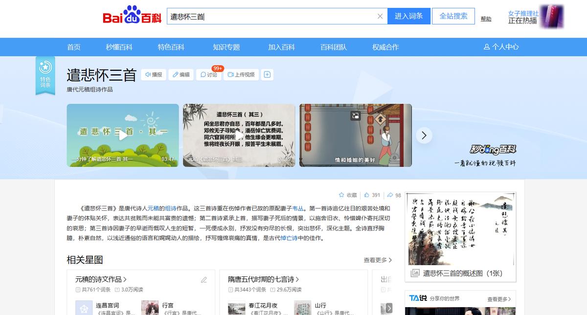 除了《离思五首》,还有一首《遣悲怀三首》,也就是“贫贱夫妻百事哀”这句诗的出处。
