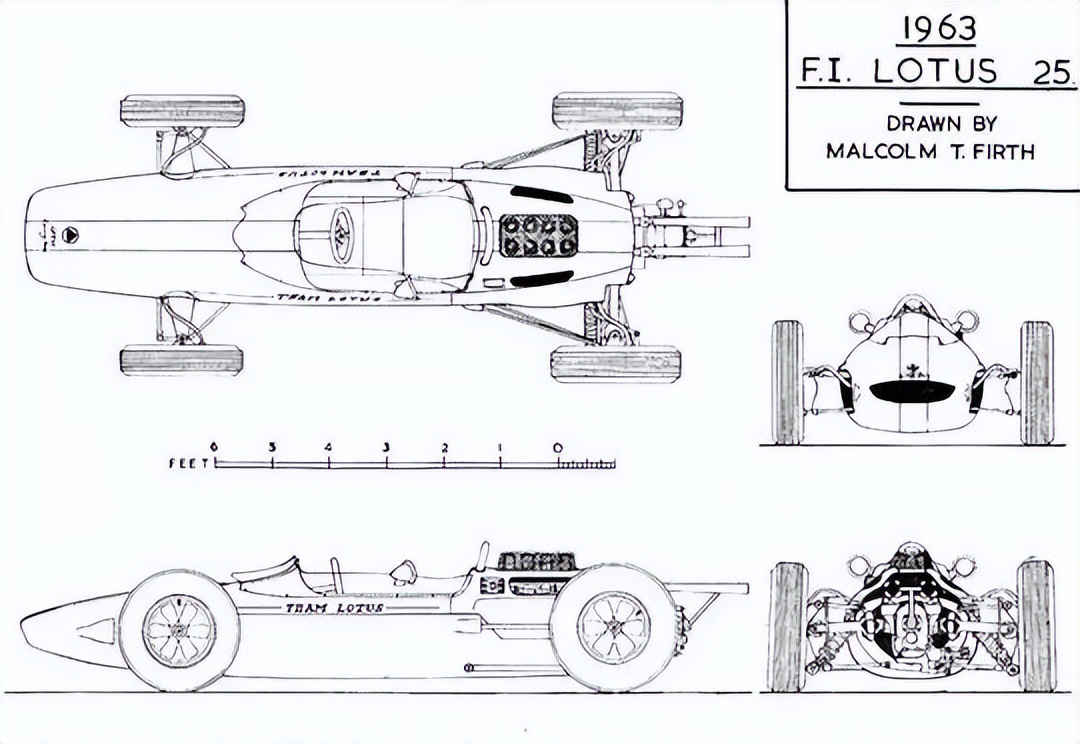 查普曼从飞机上汲取灵感,在莲花 25 上革命性的采用了单体式底盘,也就是现代 F1 的那种中间一整个壳体,当年的对手那都是几根钢管焊接在一起的,莲花这样把底盘与车身连成一体,想想都知道这个强度高不少是吧。
