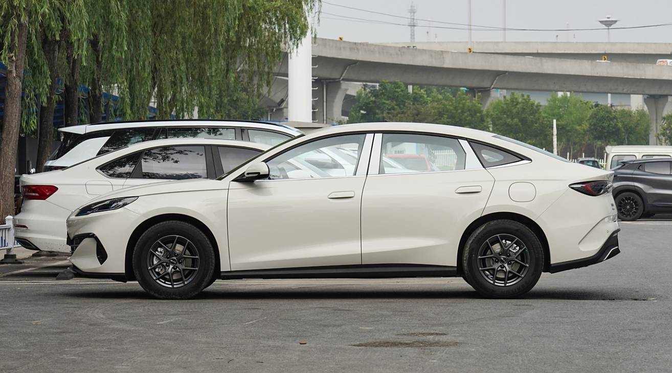 首先看外观,大部分人肯定不会一上来就奔着高配去买,毕竟它最大的噱头是9.98万的中型车嘛,所以最便宜的车型表现如何很重要。首先从正脸看,入门款与顶配车型相比也没啥差别,这一点值得点赞。不过到了侧面就能看出差异了,它有三种不同规格的轮毂,分别对应低中高配车型。9.98万的入门款采用的是16寸轮圈,对于一台中型车来说略小,但比亚迪下了心思,它的颜值还不错。预算不够设计来凑嘛,熏黑的五幅条风格跟很多跑车性能车的轮毂很相似,它巧妙的避开了自身的缺点,跟车身融合的蛮好。