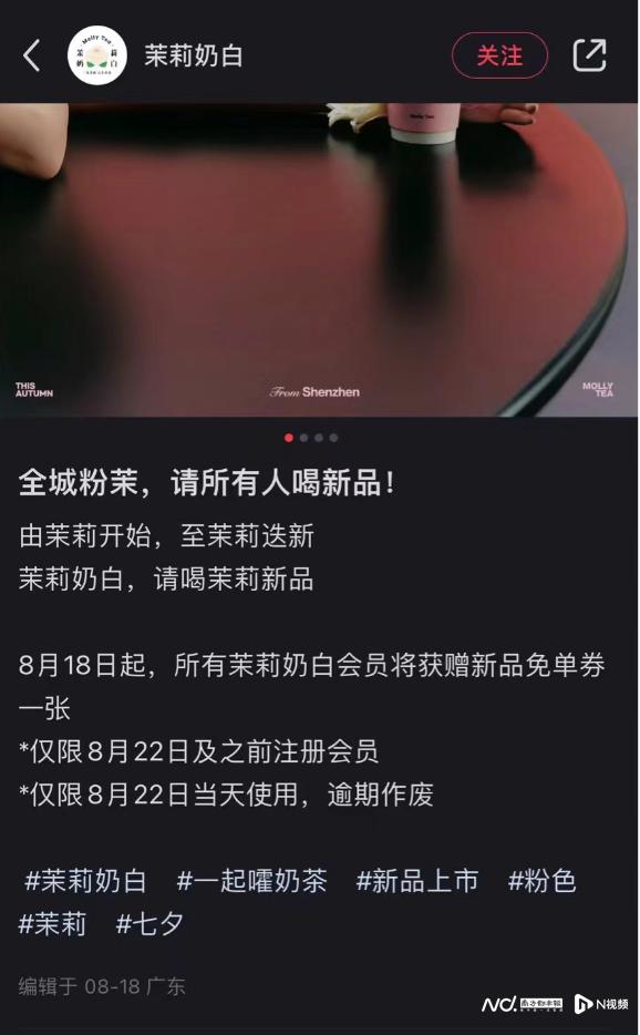 8月18日,茉莉奶白在小红书上发布推文称,自8月18日起,所有茉莉奶白会员将获赠新品免单券一张,可免费尝鲜其在8月22日推出的新品粉茉针王,活动“仅限8月22日及之前注册会员”“仅限8月22日当天使用,逾期作废”。此外,茉莉奶白在8月21日于官方公众号同样发布了免费赠饮的活动。