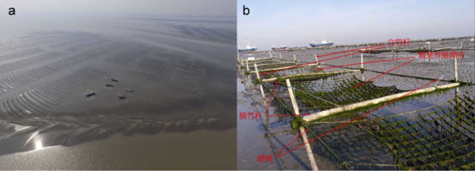 苏北浅滩竹根沙全貌和紫菜养殖筏架 来源:张清春等人《苏北浅滩养殖筏架附生绿藻入海过程在黄海绿潮形成中的作用》