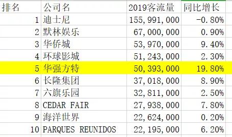上图为2019年全球前十主题乐园的流量排名,虽然迪士尼的增速同比为负值,但依旧以超1.5亿人次的流量远远抛离排名第二的默林娱乐。