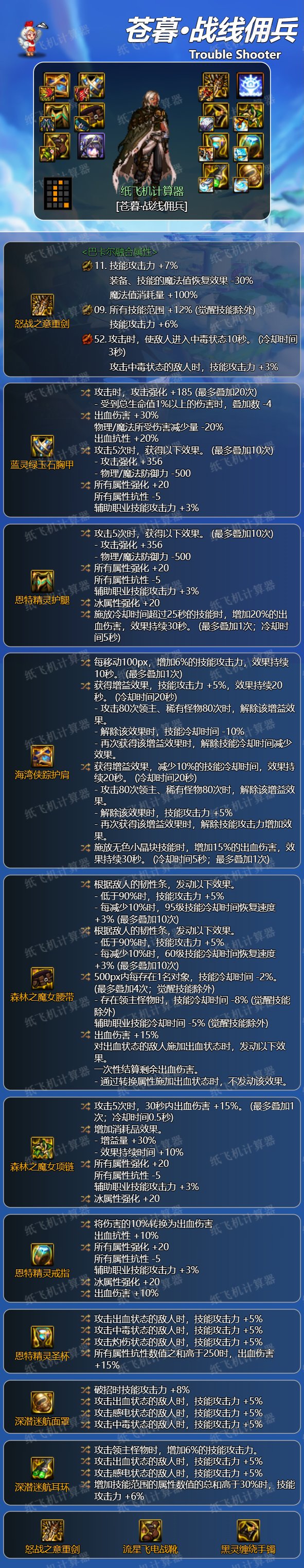一套比较综合的直伤搭配,三速,cd,伤害都在线,缺点是核心自定义部件(海湾腰带、蓝灵裤子、魔女戒指)偏冷门,若手上有现成的睡眠流自定义可以进行该搭配